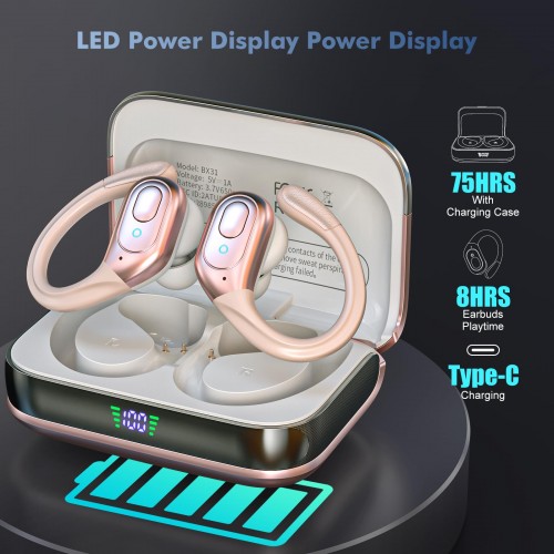 Bluetooth Headphones Wireless Earbuds with 75Hrs Playback, LED Display Charging Case, IPX7 Waterproof, Over-Ear Design Ear Buds for Sports/Running/Workout - White